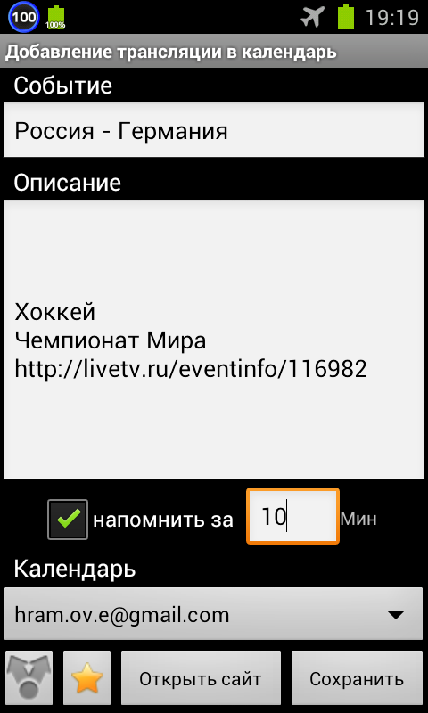 В любом из списков если кликнуть по интересующей трансляции откроется окно добавления события в календарь.