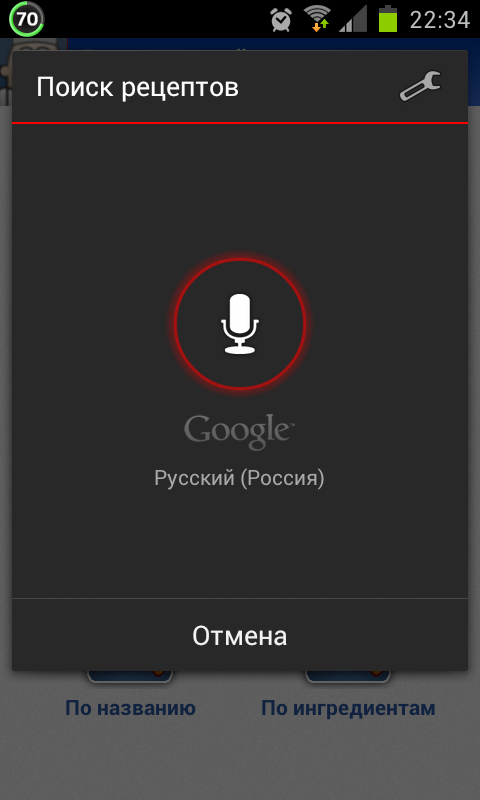 Поиск рецептов по названию интегрирован в глобальный поиск Android вызвать который можно нажав на кнопку «Поиск» вашего телефона. В моем случае это долгое нажатие на кнопку «Меню». Благодаря этому для поиска рецепта нет необходимости запускать программу.