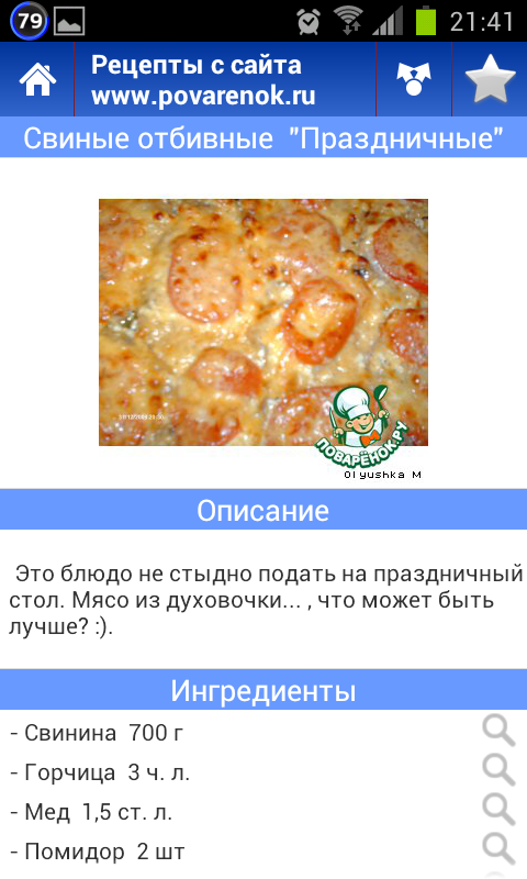 Быстрый и удобный поиск по названию. Результаты поиска отображаются сразу при вводе текста. Нажав на кнопку «Поиск» на клавиатуре вы получите полный список найденных рецептов или можете выбрать понравившийся из выпадающего списка.