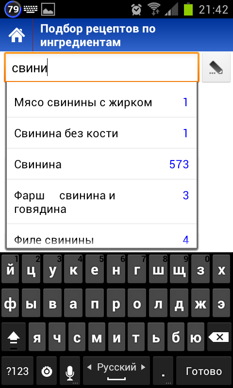 Как только вы начинаете вводить название ингредиента, вам предлагается список доступных ингредиентов, который уменьшается по мере ввода. А самое главное можно посмотреть сколько рецептов есть с каждым из них.