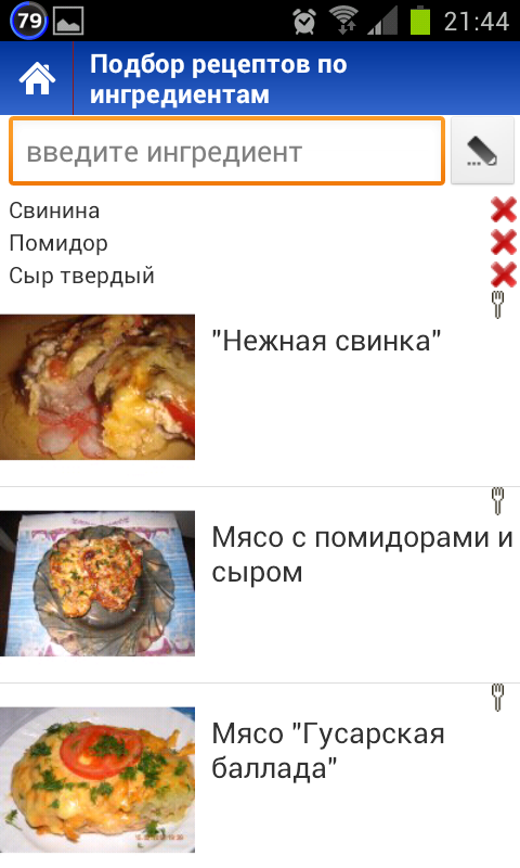 Главной для меня гордостью является функция поиска рецептов по ингредиентам. Есть много сайтов и программ, в которых реализован такой функционал, — скажете вы. Я с вами не соглашусь. Во всех реализациях, что я видел, меня раздражало то, что при вводе ингредиента я не понимал есть ли такой ингредиент в базе программы. Необходимо было ввести слово полностью, нажать кнопку поиска и в случае неудачного поиска гадать толи я ингредиент ввел не правильно толи рецептов нет с таким ингредиентом. Потому смело могу сказать, что реализовал самый удобный поиск рецептов по ингредиентам.