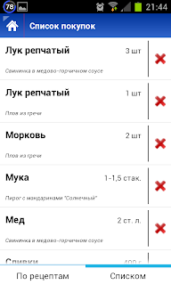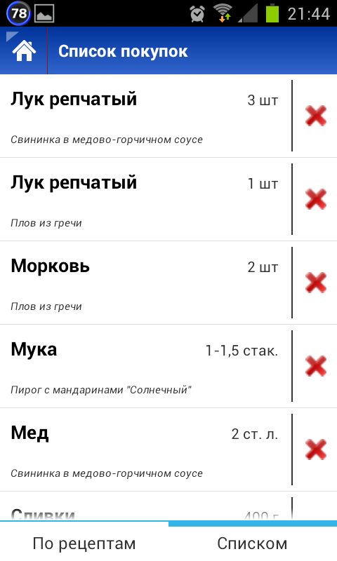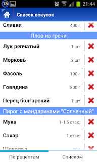 Корзина покупок состоит из двух списков. В режиме отображения «По рецептам», думаю вы уже догадались, ингредиенты сгруппированы по рецептам. Удобно удалять лишние, если вдруг передумаете готовить какое то блюдо.